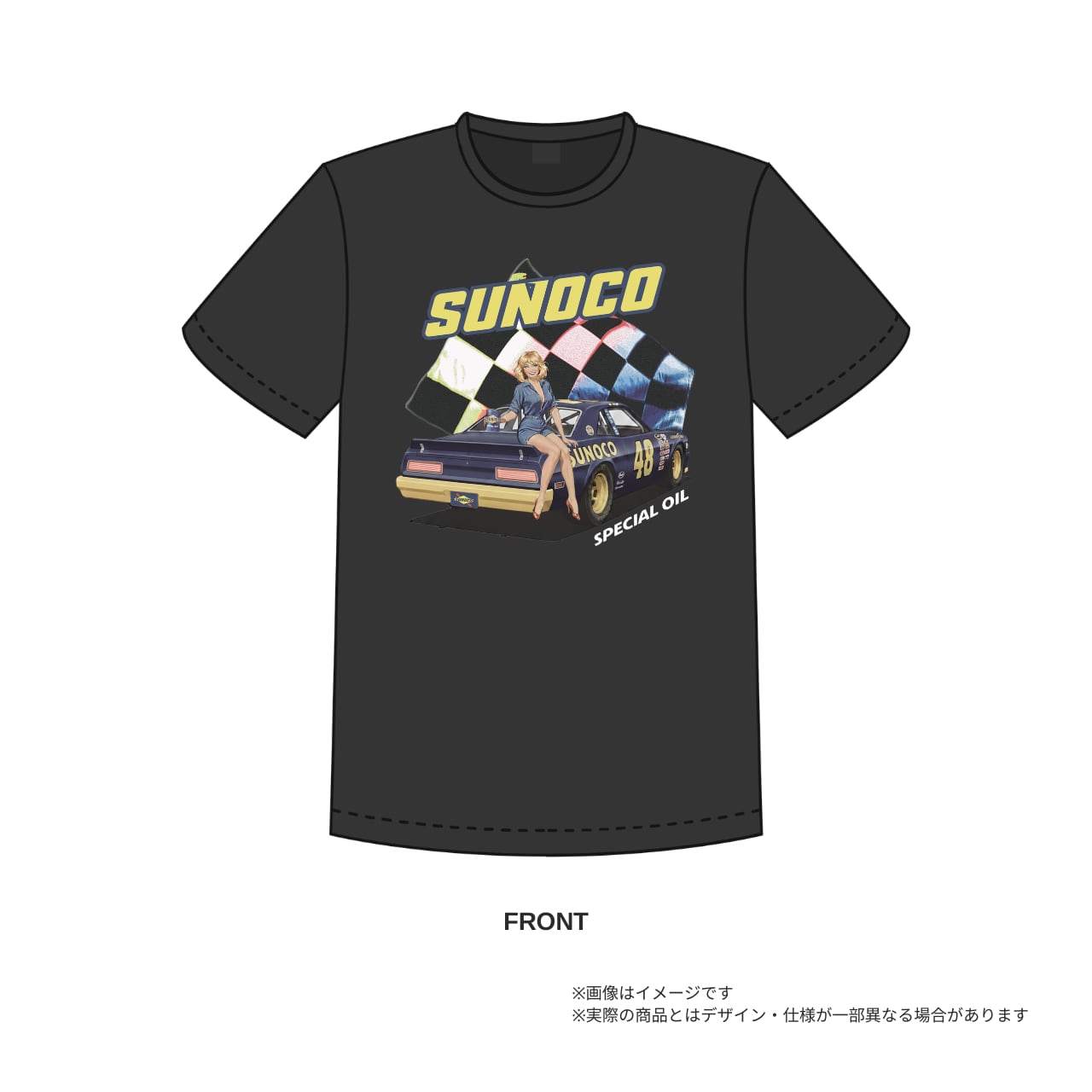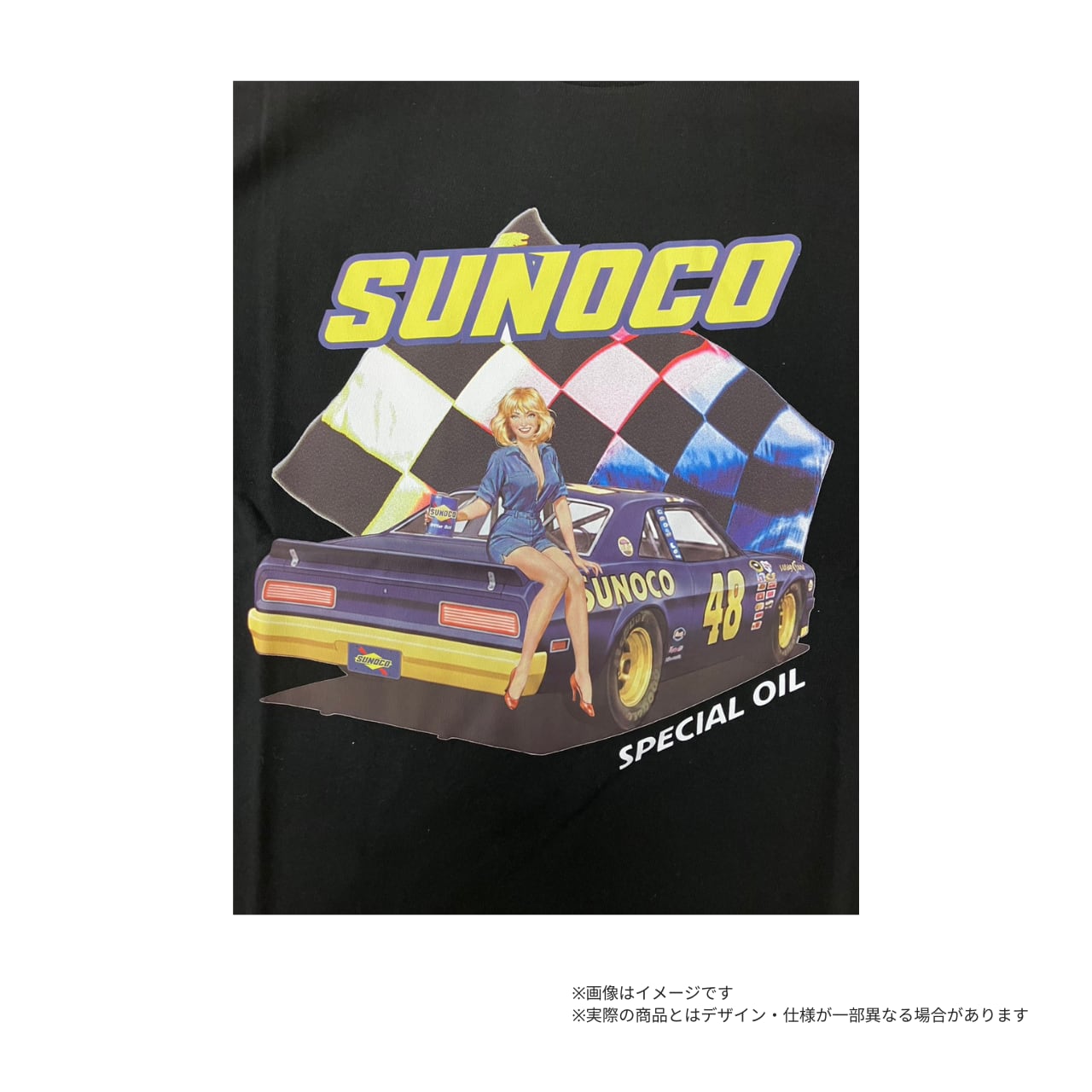 オープンエンド糸を採用し、リング糸よりも吸湿性に優れているだけでなく、アメリカルーツを意識した粗野な仕上がりが特徴的。往年のNASCARを連想されるイラストで、レーシーな印象に仕上げました。
